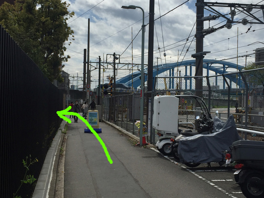 狭い歩道を右方向へと行きます。右側に電車が並行して走っています。