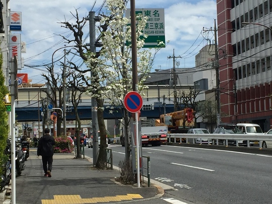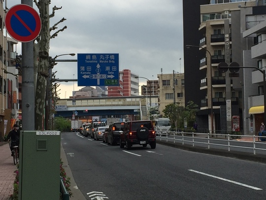 道路標識が見え、その先に歩道橋も見えて来ます。