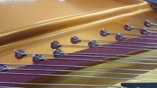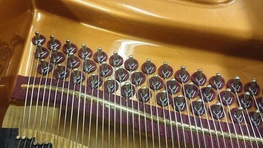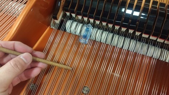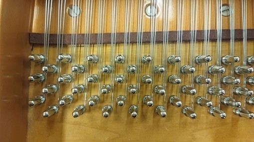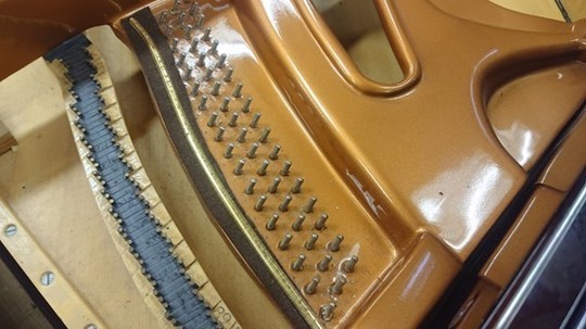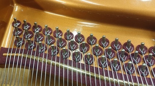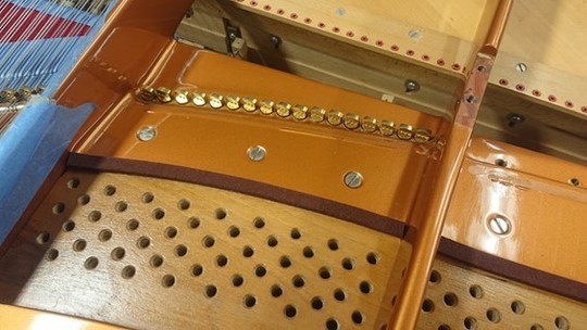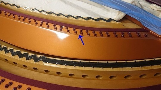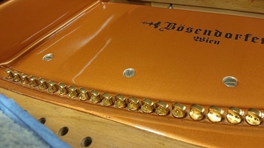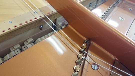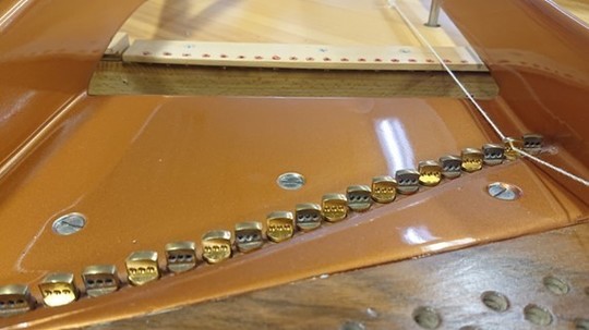 ベーゼンドルファーの総1本張りとこの特殊な玉の作り方は、弦を捻らず張ることで透明感のある音を奏でる目的の他に、「音を狂いにくくする」という目的もあります。しっかりこのような作業も行わないと、せっかくのこの仕組みの意味がなくなってしまいます。