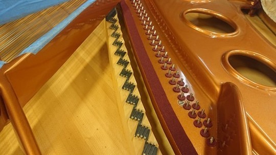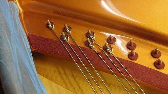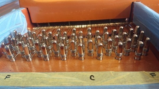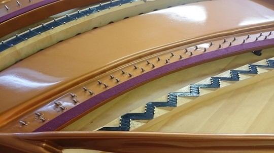 1本1本取り付けます。ベーゼンドルファー特有の非折り返し弦にて1本づつ独立しています。