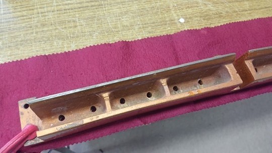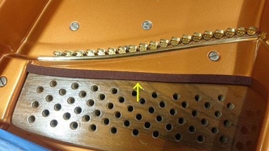 ヒッチピン・パンチング・クロスも取り除きますと、インペリアルは高音のバックストリング部は必ず弦枕フェルトの上に真鍮バーが置かれています。